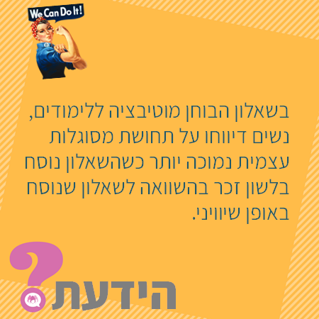 מחקרים רבים מבוססים על שאלונים במילוי עצמי, בהם המשתתפות/ים מתבקשות להשיב לשאלות לפי מה שהכי נכון עבורן/ם. מחקר ישראלי בחן את ההשפעה של שימוש בלשון זכר לעומת לשון נייטרלית בשאלון שבוחן מוטיבציה ותחושת מסוגלות ללימודים אקדמיים. במחקר נמצא כי נשים שהשיבו על שאלון שנוסח בלשון זכר דיווחו על 'מוכוונות פנימית למשימה' נמוכה יותר (=כמה הן פועלות למען הגשמת מטרה אישית שלאו דווקא משרתת מטרה חברתית); על 'ערך משימה' נמוך יותר (=כמה חשיבות הן מייחסות להשלמת המשימה); ועל תחושת מסוגלות עצמית נמוכה יותר (=עד כמה הן מרגישות שיצליחו להשלים את לימודיהן). צוות החוקרות והחוקרים הסיק כי להטיה שבה מנוסחים שאלוני דיווח עצמי (זכר/שיוויוני) יש השפעה ייחודית על תוצאות הדיווח אשר יכולה להשפיע על תוצאות הבדיקה כולן. באופן יותר ספיציפי, נראה כי השימוש בלשון זכר משפיע לרעה על הדיווח העצמי של נשים. מחקר זה מעלה את הצורך לבחון מחדש אינספור מחקרים במדעי החברה שייתכן כי הושפעו מהטיה זו, ולבחון האם קיים אפקט דומה גם במבחנים הבוחנים ידע ועמדות, בנוסף לשאלוני הדיווח העצמי. #דברו_אלינו_במחקרים הצטרפו אלינו לדברו אלינו בלשון נקבה ביום האישה 2017 מקור: Vainapel, S., Shamir, O. Y., Tenenbaum, Y., & Gilam, G. (2015). The dark side of gendered language: The masculine-generic form as a cause for self-report bias. Psychological Assessment, 27(4), 1513.